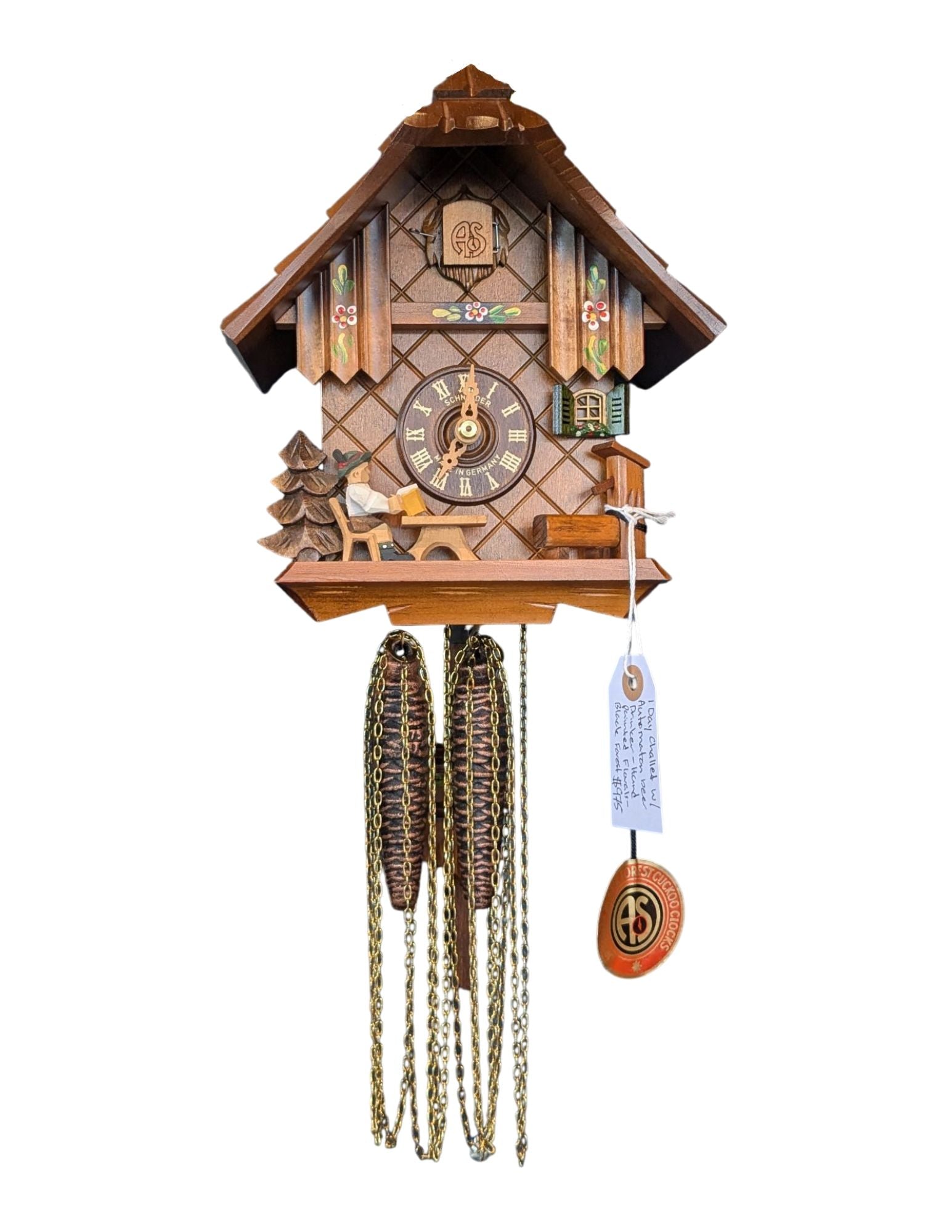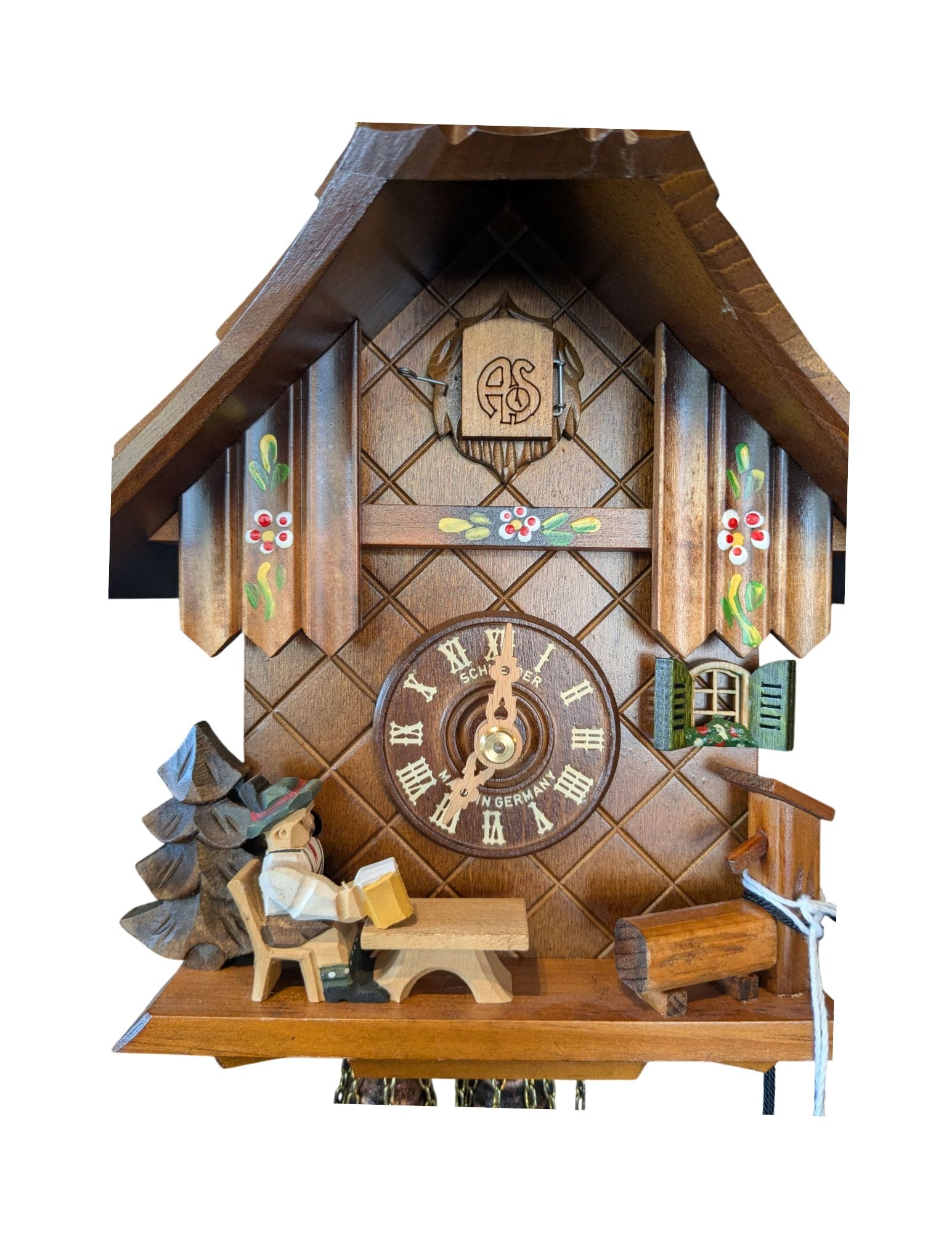 Lovely chalet with hand painted florals features an automaton beer drinker who raises his arm with every cuckoo.