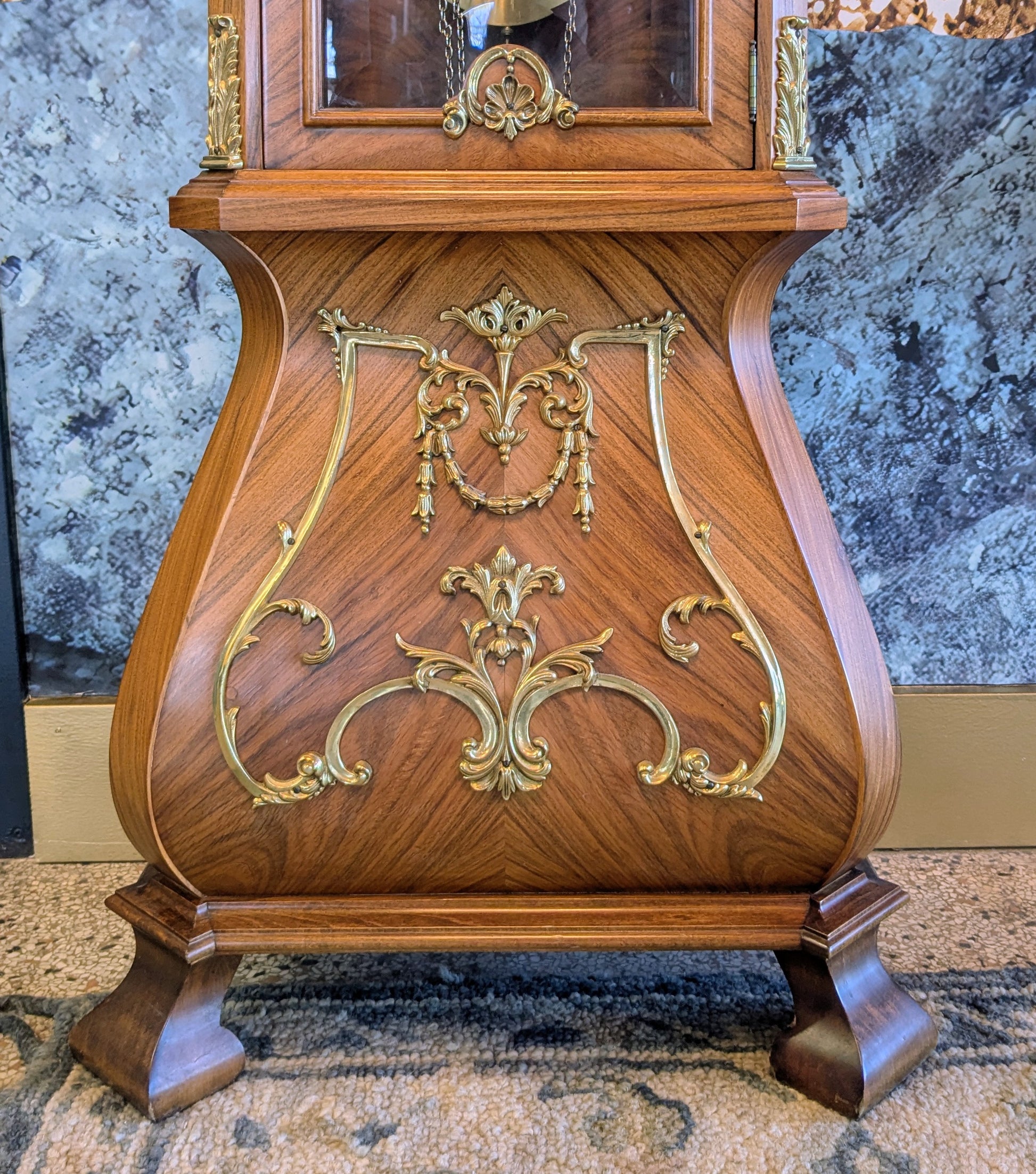 Classically eighties opulence, this Spanish made clock is decked out in: brass details, porcelain dial with hand painted numbers, in a honey oak finish. Wind it once a week by pulling on the chains and be the envy of all your friends.