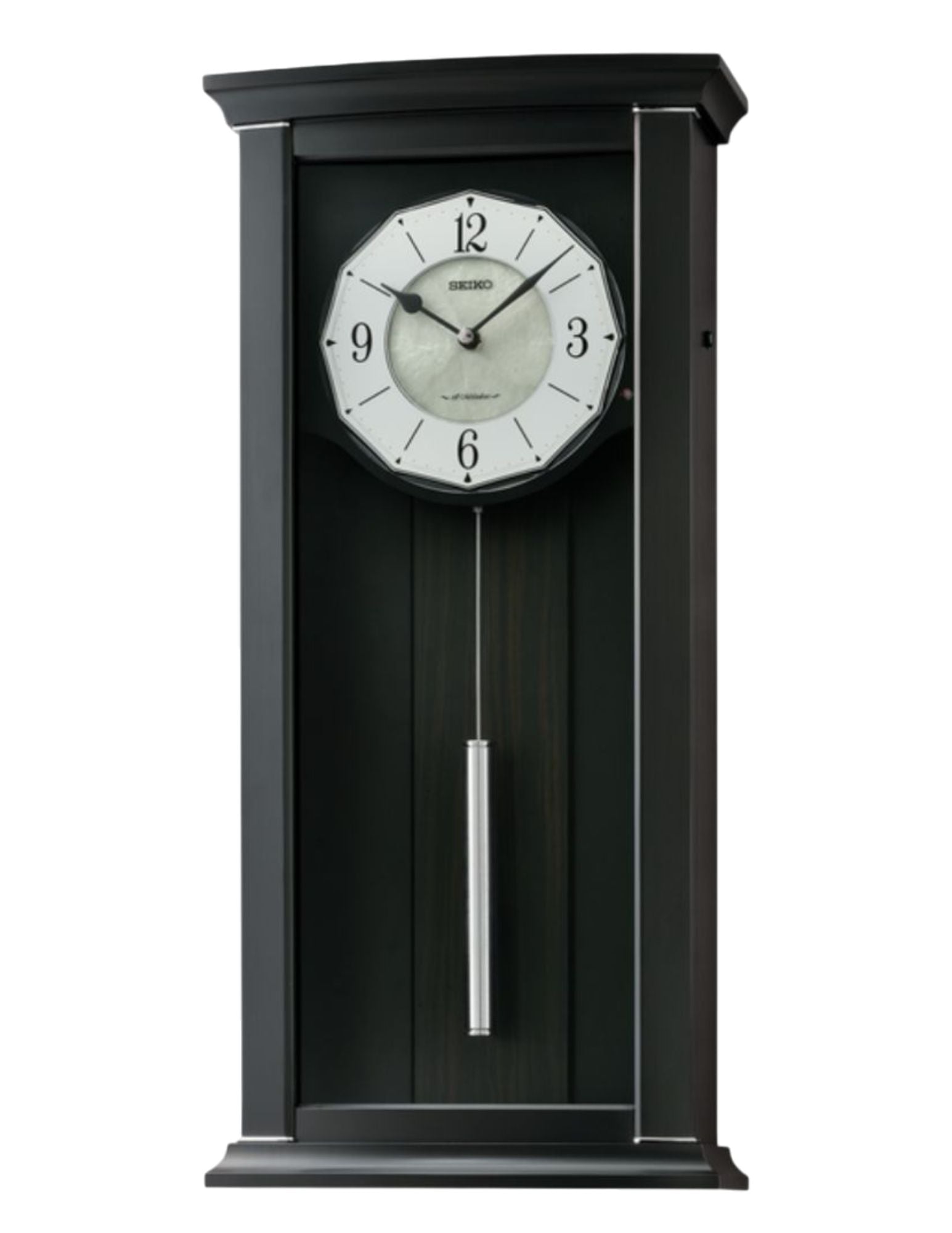Crafted with attention to detail, this clock is a true work of art. Its clean lines in a dark wooden case are enhanced by the light Mother-of-Pearl dial and the sleek stylish modern silver-tone slim pendulum. Volume control allows you to raise or lower the music all while the light sensor disengages the music when it becomes dark.