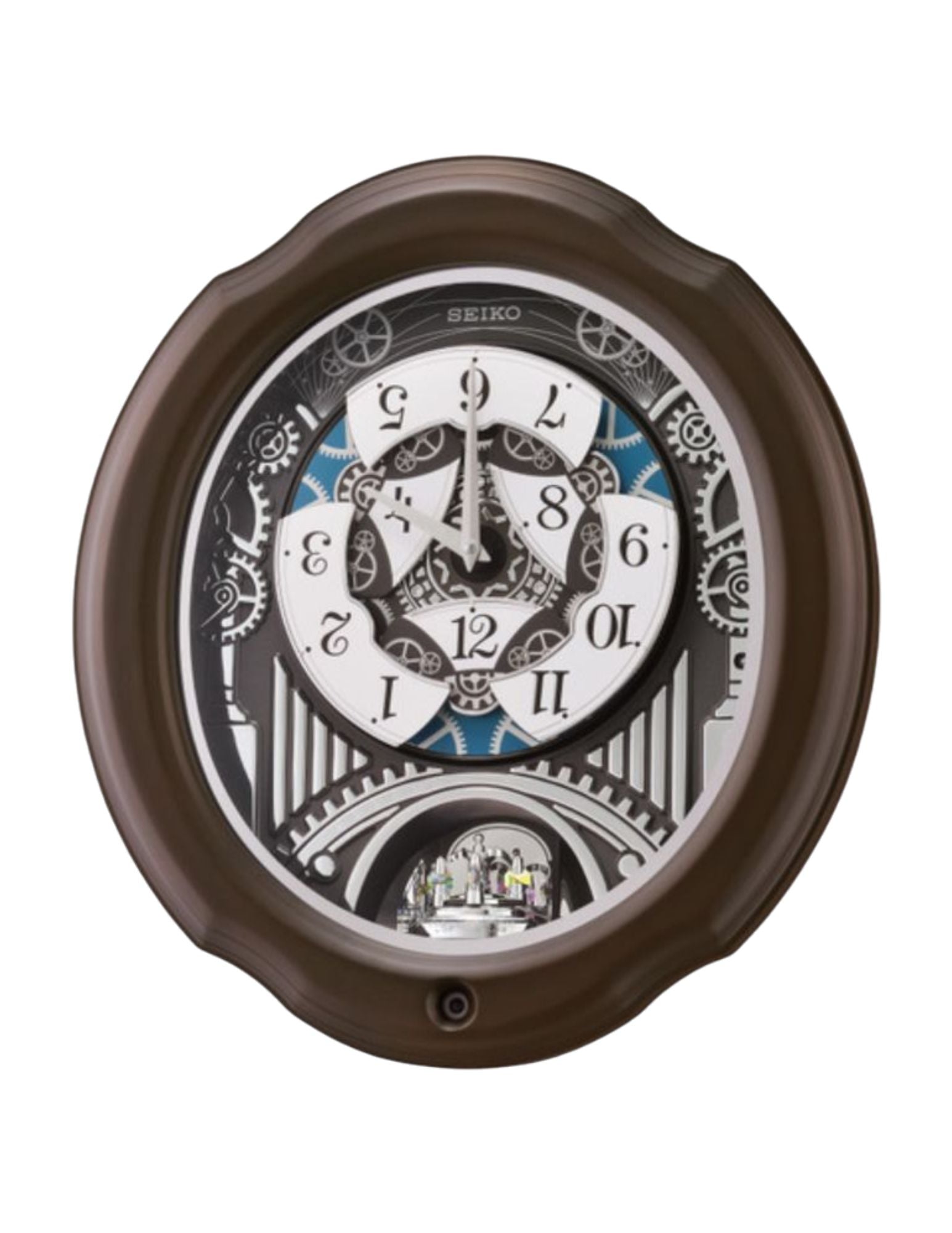 On the hour, the dial opens to reveal a turning decorative wheel and plays one of thirty-six of the finest quality sound melodies plus an opening and ending melody. Notable features include : pendulum features colorful crystals, and an off/on switch.