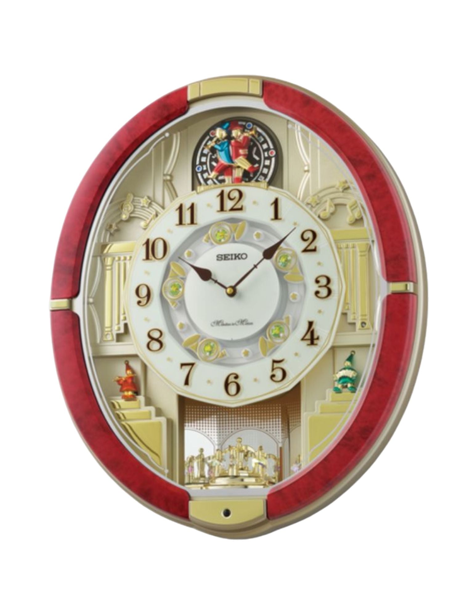 On the hour, the dial opens and turns, and plays one of thirty of the finest quality sound melodies. Notable features include : a marble pattern red case with golden accents, a demonstration button, and volume control.