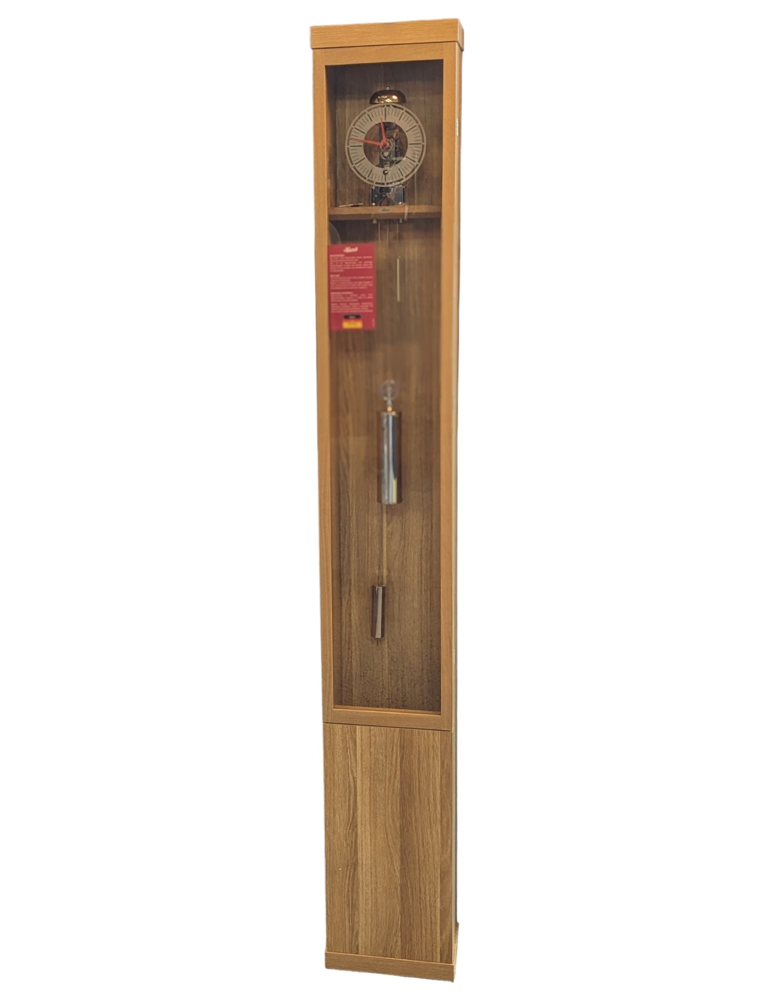 The perfect floor clock for beginning clock lovers and modern minimalist alike, this tall wooden case exemplifies the simplicity of a skeleton clock movement that can fit any space!